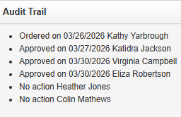 - The audit trail will be displayed beneath the Purchase Order and Invoice section
