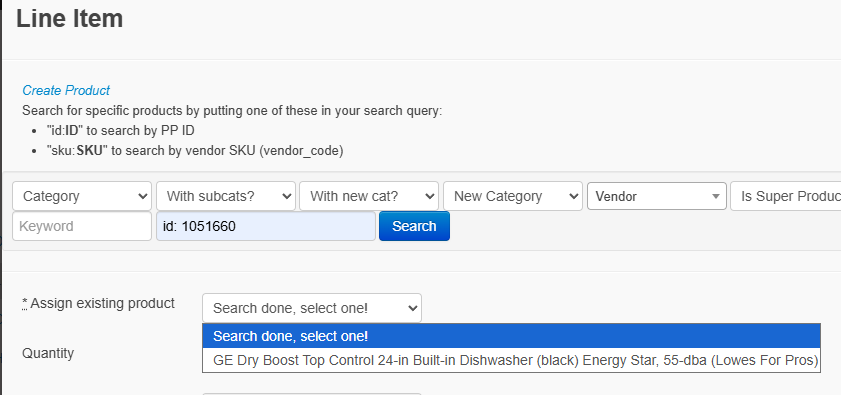 - If the product exists click "Add Line Item" while on the "Line Item" tab